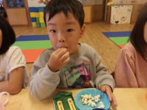 給食の先生が作ってくれるできたてのおやつは、いつも美味しくてみんなの笑顔がいっぱいです。