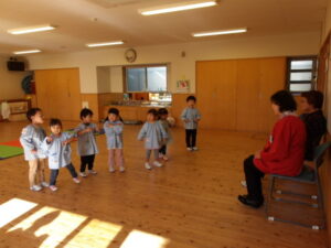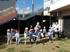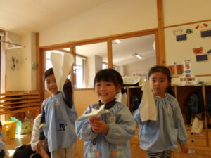 ひよこ・年少組ではわらべうた遊びをしたり、紙飛行機を一緒に作って飛ばしたり、ダンスを発表したりしました🎵