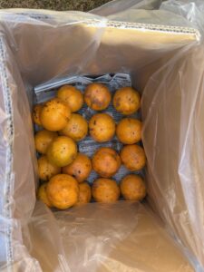 ヘタの部分を焼酎にチョンチョンとつけて…段ボール箱にいれて…おいしい柿になぁれ!