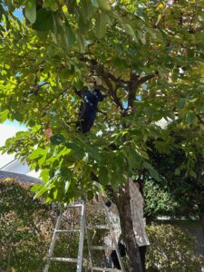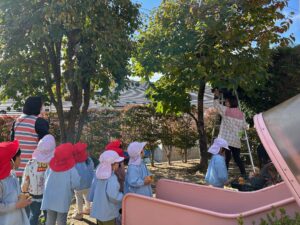 晴天の中、北棟園庭に実ったかりんと柿の収穫を行いました。