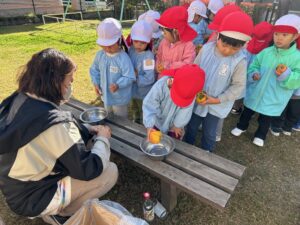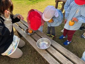 柿は焼酎付けにしました。「今よりもっとおいしい柿に変身するんだよ!給食で食べるのが楽しみだね!」と話すと、満面の笑みがいっぱいでした。