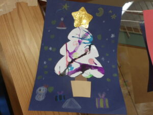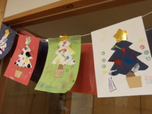 乾いた絵を切り取って、クリスマスツリーにしてお部屋に飾りましたよ。