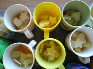 リンゴを星、ハートで型抜きしてフルーツポンチの中にこっそり入れてみると、