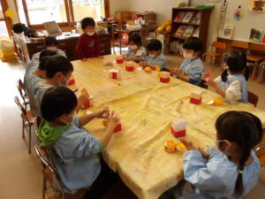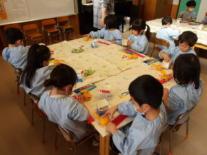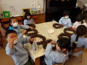 家庭から思い思いの装飾を持ち寄り、どんな飾りを持ってきたのか友だちと見せ合い、ワクワクしながら作り進めていました🎵