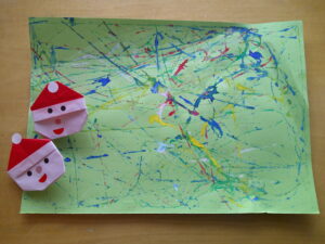 ビー玉に絵の具をつけて転がしてツリーの模様をつくりました♪