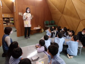 地域の図書館に親しみ、読書への興味関心を高めることを目的として、針生ヶ丘病院の近くにあるクローバー図書館に施設見学に年長児で行ってきました。