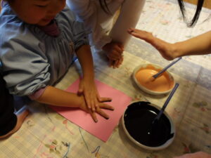 絵の具を手に塗って、せーのっ!ポンッ!と掛け声を出しながら画用紙に手形を。