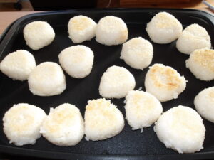 ホットプレートで焼きおにぎりのライブキッチンです(笑)。