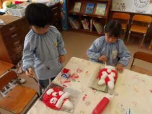 年長さんでは、張り子のお面を何日も時間を書けて丁寧に作りました。