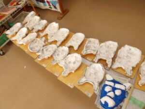 それぞれの学年で様々な素材や技法を使ってかっこいい鬼のお面が出来ました!!