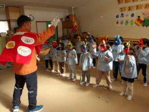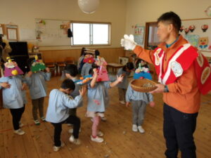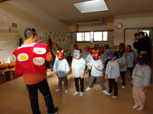 各クラス、お面を被り鬼に変身し、園長先生に豆を当ててもらって心の悪い鬼を退治する事が出来たようです。
