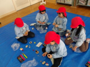 ボンドで木材を貼り合わせたり、色を塗ったり、目玉を付けたりして楽しみながら作っていました🎵