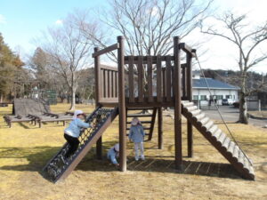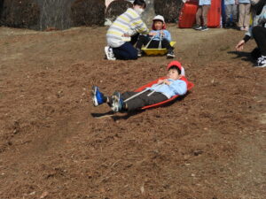 雪でのそり滑りは出来ませんでしたが、工作をしたり、広場で松葉のそり滑りや遊具遊びをしました。