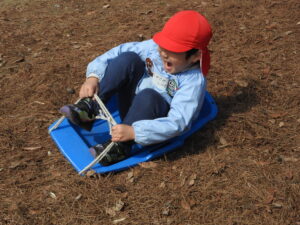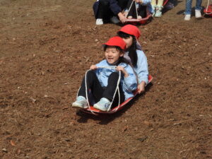 松葉で滑りやすくなった斜面は思ったよりスピードが速く、楽しい悲鳴をあげながら繰り返し取り組んでいました!