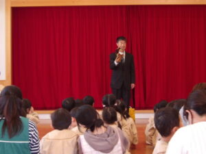 始業式では、園長先生から新しいクラスの先生の紹介や、挨拶や遊びを頑張ろうねとお話を聞きました。