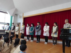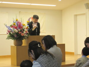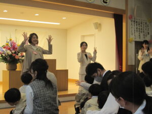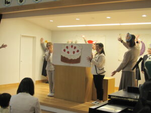 先生たちと手遊びをしたり、ケーキのお話をきいたりして入園式を過ごしました。