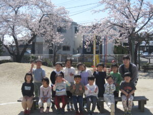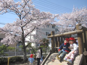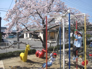 新学期を迎えた子どもたちは、満開の桜の下で春休み明けで再開したお友だちと誘い合って遊び始める姿がありました。