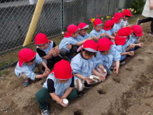 種芋を土の中に植えるとじゃがいもが育つ事に半信半疑の子もいましたが、これから生長を通して学んでいくのだと思います。